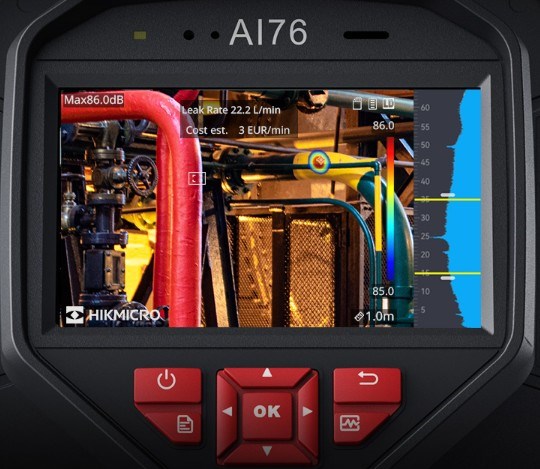 • Kvantifiering och Besparing: Många moderna kameror kan, via inbyggd mjukvara kvantifiera läckaget i volym (t.ex. liter/minut eller CFM) och omedelbart uppskatta den årliga energikostnaden för läckaget. Detta ger ett direkt beslutsunderlag för underhållsteamet om vilka läckor